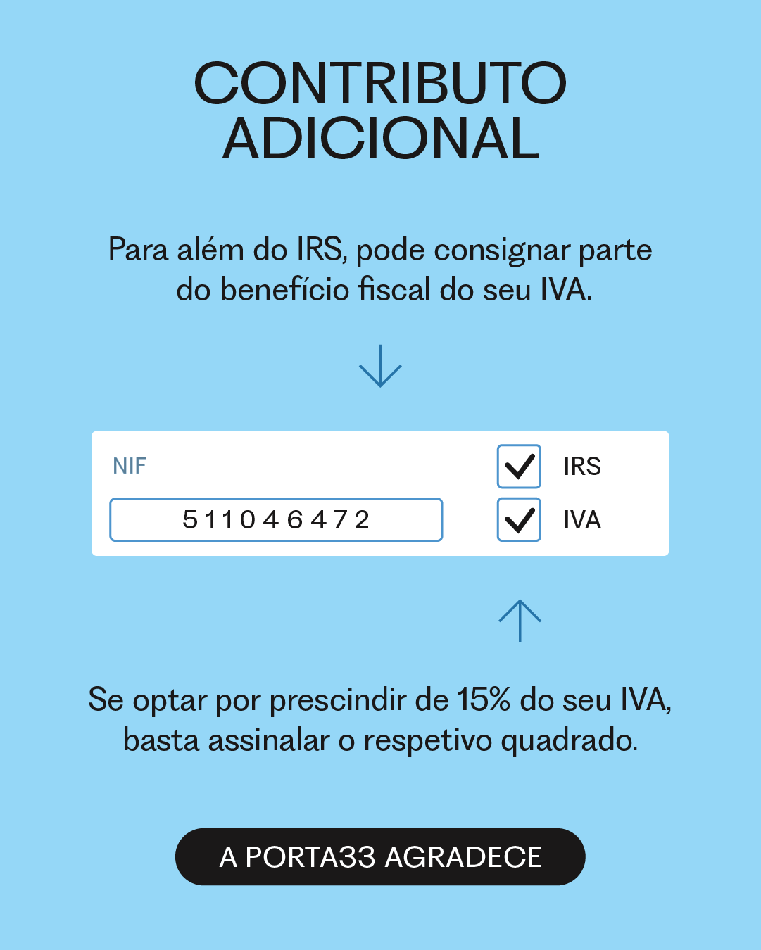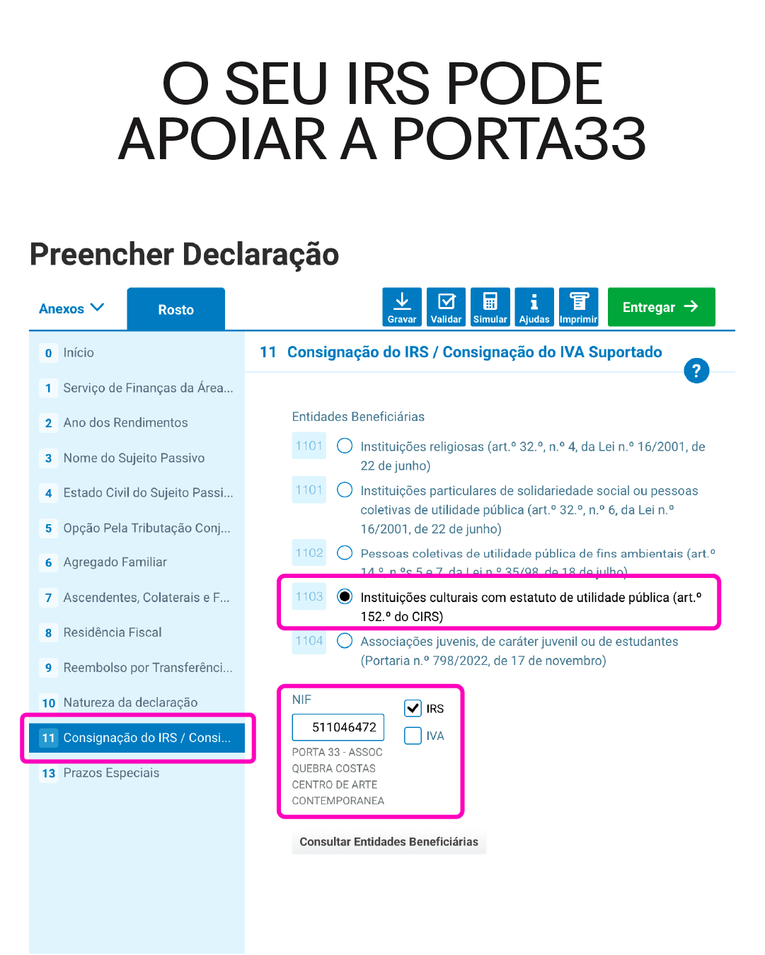 Independentemente do formato de entrega e da categoria de rendimentos, preencha o quadro 11 com o NIF da PORTA33: 511 046 472 Se também quiser fazer um donativo adicional à PORTA33 pode optar por prescindir dos seus 15% do