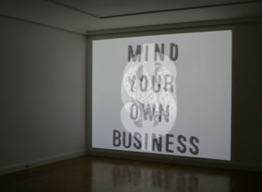Três imagens – um cérebro, um cifrão e a frase “mind your own business” – entrelaçam-se a uma velocidade vertiginosa, superior à capacidade do olho humano para as apreender separadamente (cada imagem dura apenas dois frames, à velocidade de vinte e cinco frames por segundo). A velocidade a que imagens alternam, na iminência de se fundirem, obriga o espectador a uma experiência de percepção incomodativa, difícil de suportar por muito tempo, devolvendo-lhe com sentido irónico a afirmação contida no vídeo (“mete-te na tua vida”). Como noutras obras do artista, a equivalência literal entre o título e a organização dos elementos visuais produz uma abertura e instabilidade a nível semântico, convidando o espectador a introduzir a sua subjectividade no acto de percepção e interpretação. Mind Your Own Business foi originalmente criado num computador Amiga 2000 e transferido para VHS, até ser mais recentemente fixado em suporte DVD.